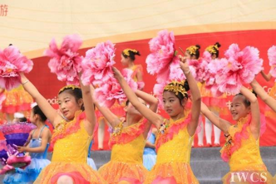 当地的孩子们在开幕式的舞蹈节目上手捧鲜花,欢迎所有参与盛会的嘉宾