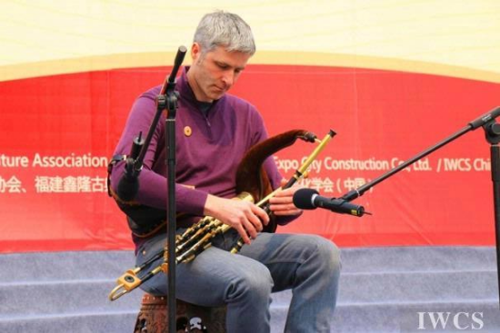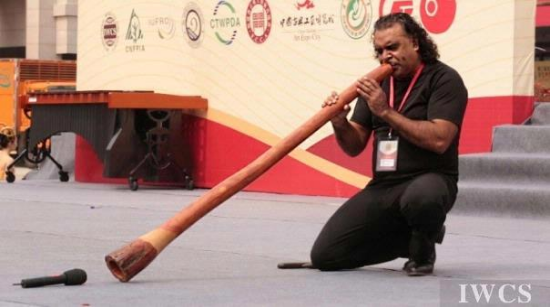澳大利亚音乐家David Hudson表演了迪吉里杜(didgeridoo),这是一种来自澳大利亚原住民的木制乐器