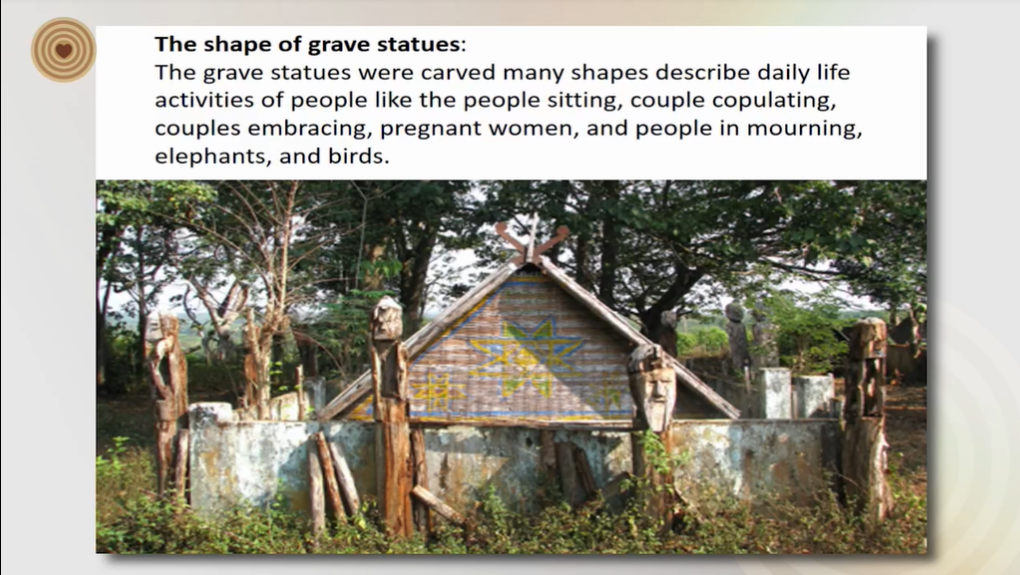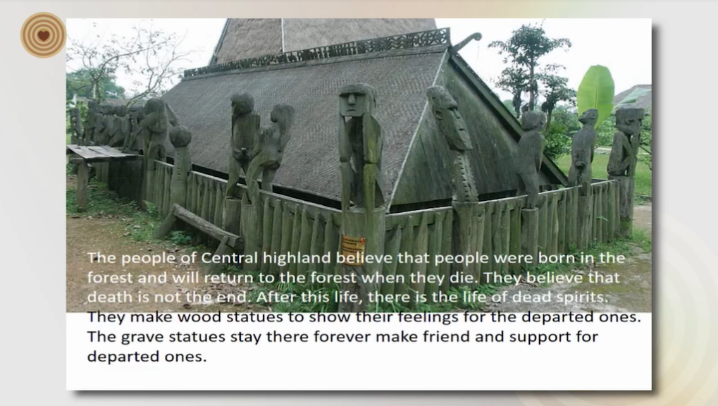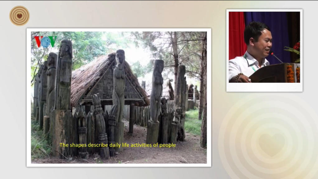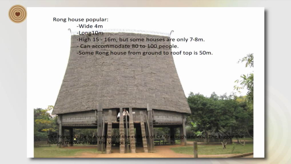 The Rong House of each ethnic group has its own architectural style, design, and decor. In the village, it is often the biggest house roofed and having 8 big wood columns. The connection of wood frame house is used by tenon. The wood ussually used for house is high quality wood. In the grave house, according to aged old customs of ethnic minority groups in the Central Highland, after the burial of the deceased they built house to shelter from rain and sunshine. The grave house is surrounded with a wooden fence within there is a wooden statue resembling a human being, a bird or an animal. Expressiveness and shape of the statue reflects the daily activities and cultural of human, like as couples embracing, pregnant women, and people in mourning, elephants and birds.