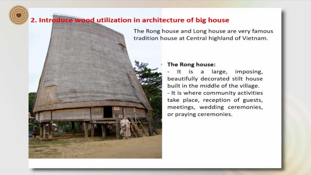 The research showed this ethnic used wood mainly in architecture and grave house. In architecture, The Rong house is the most famous architecture, it is a symbol of the culture of Central Highland, an age-old and stable culture. The bigger the house, the wealthier the village is. It is a pride of the whole village. The Rong house can only be found in villages in Gialai and Kontum provinces. It is a large, imposing, beautifully decorated stilt house built in the middle of the village. It is where community activities take place, reception of guests, meetings, wedding ceremonies, or praying ceremonies.