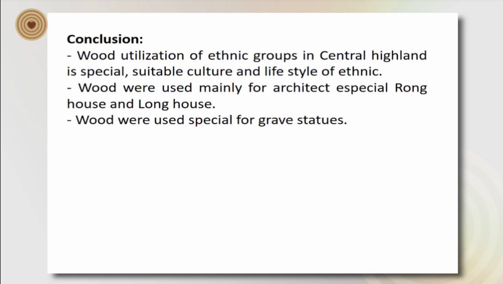 Vietnam has 54 ethnic groups, is located from Nourtherm to Southerm of Vietnam, in which the largest is Kinh ethnic. Central Highland located at Southerm of Vietnam, where some ethnic minorities have been lived. The life of them has enclsose relationship with forest and wood from forest. This paper researched on the way to utilize wood of some ethnic in the Central Highland of Vietnam, in Gialai and Kontum province.