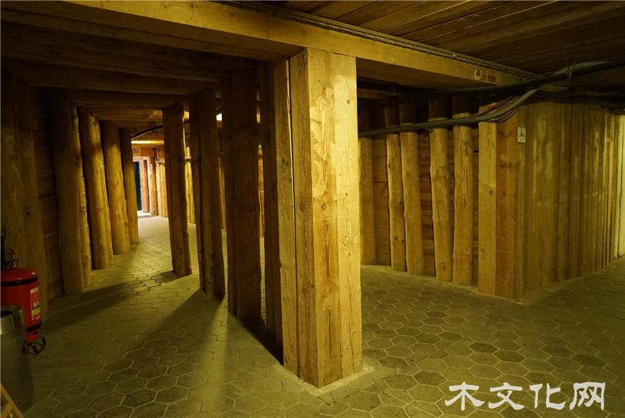 穿过一扇扇被称为“空气锁”的木门后,这里的一根根木柱被矿工刷上了白色涂料,第一是用来防火,第二是用来反射矿工身上小小矿灯的光亮。沿着矿道前行,一处有着500多年历史的木构件映现在眼前。这是井下最古老的木构件,500多年来,巨大的原木在潮湿的环境里被充满矿盐的空气所浸润,已经深深地从里到外包裹着浓浓的盐,早已成为了最好的防火材料,这也使木材得到了最好的保存 。