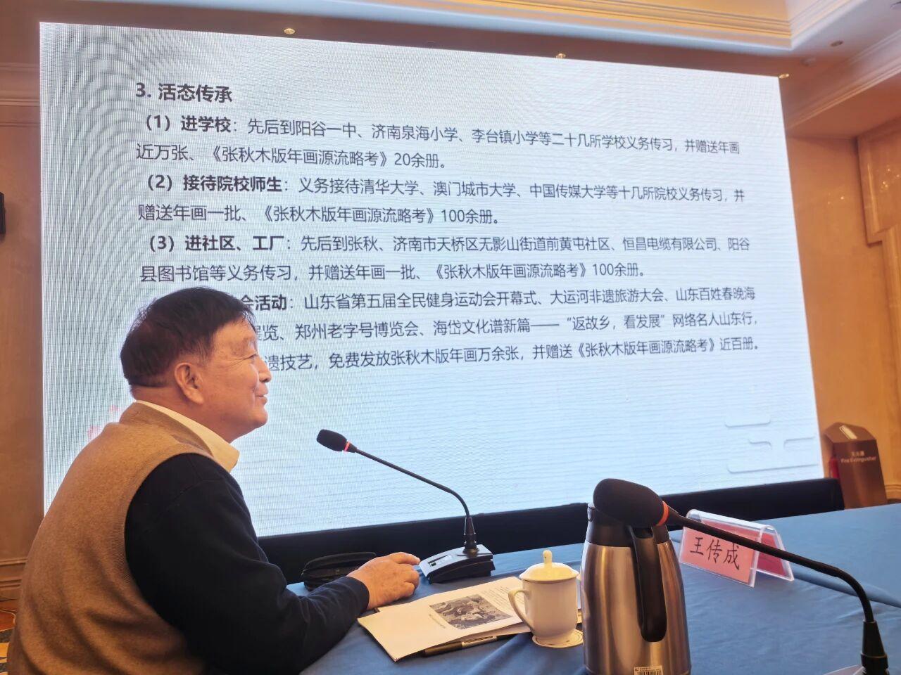 在大会交流发言中,王传成先生详细介绍了张秋木版年画的传承保护与创新发展情况,展现了非遗传承的坚定信念与创新实践。