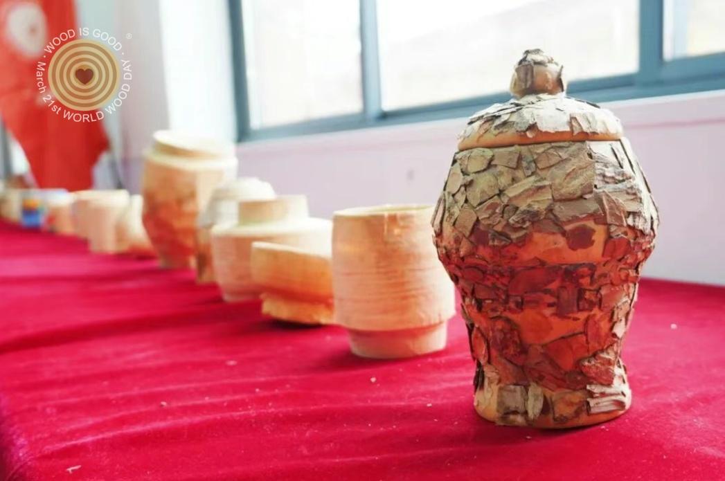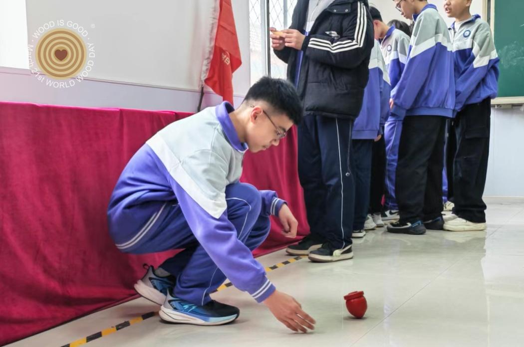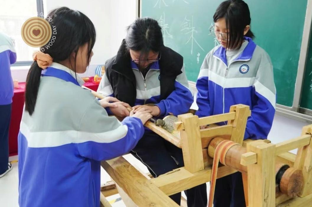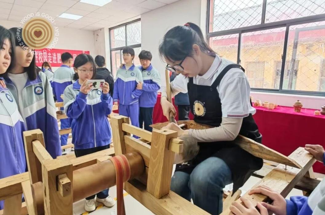 科普展板前,同学们驻足聆听,认真了解世界木材日的设立背景与意义,学习木材循环利用、森林保护的相关知识,明白了 “植绿、护绿、惜木” 的重要性。当讲解聚焦本地省级非遗沙窝木旋时,图文展示与短视频相结合,将这项传承五百余年的技艺娓娓道来。从选料、粗旋到雕磨、抛光的复杂流程,让在场者深深感受到老手艺的匠心与坚守。