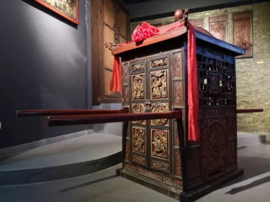 轿子,古称“舆轿”“肩舆”“腰舆”,至宋代才有“轿子”的称呼,其结构、形制也完全成熟并被固定下来,一直沿用到近代。轿子是中国古代独有的、用人 力抬扛的一种陆路交通工具,经过不断地完善和发展,其使用范围也不只限于上层统治者,富商大贾、平民庶人也多有乘坐,不过,百姓乘轿还仅仅局囿于结婚嫁 娶。轿子的结构较为简单,主要由轿身、轿座、轿底、轿顶和轿杆等五个部分组成。轿身为方形木制或竹制小屋,外面套上绣着各色龙凤、花草的轿帷子。左右两侧 开窗,窗形有方形、菱形、梅花形等,冬装玻璃夏罩纱,前边开门;轿底一般用木板做成,四角用绳子系牢于轿杆,上放轿身;轿内有木制轿座,铺有垫子,供乘者 坐;轿顶为竹席制成的拱形圆盖,需要时也可围以布幔,最顶上加一个锡制的顶子。轿顶下部是四周探出轿身的檐子,四角或方、或圆、或翘,外面罩有布料制成的 围沿,围沿下垂着些缨穗;轿身左右各有五米长的直杠,直杠两端各有绳子相连,绳子中间系短的抬杠,以放到轿夫肩上抬轿行走。这种轿子又叫“暖轿”或“帷 轿”,是所有轿子类型中的基本结构。
