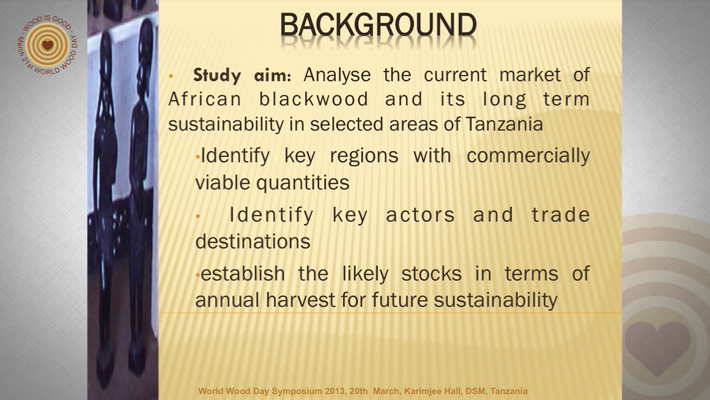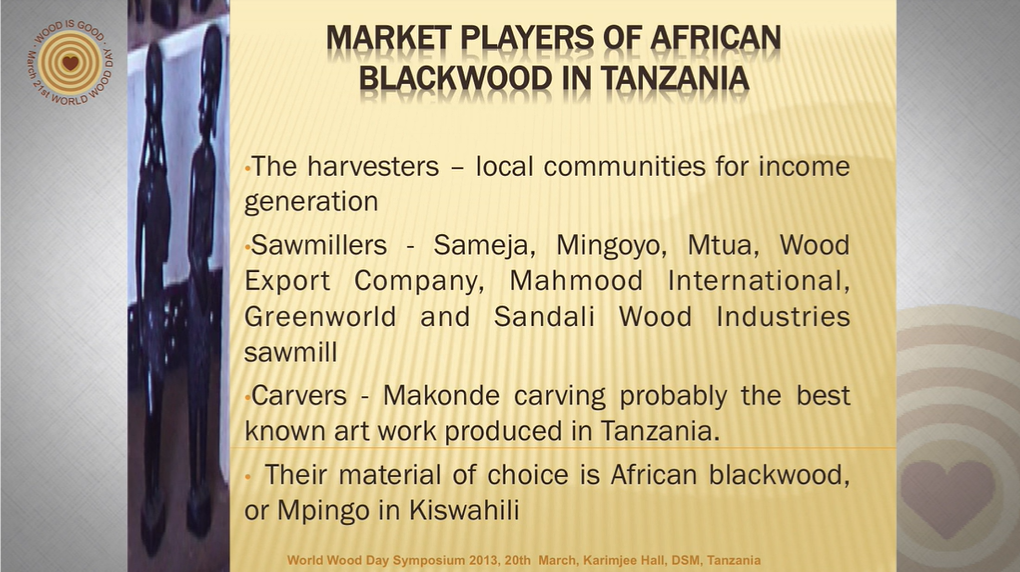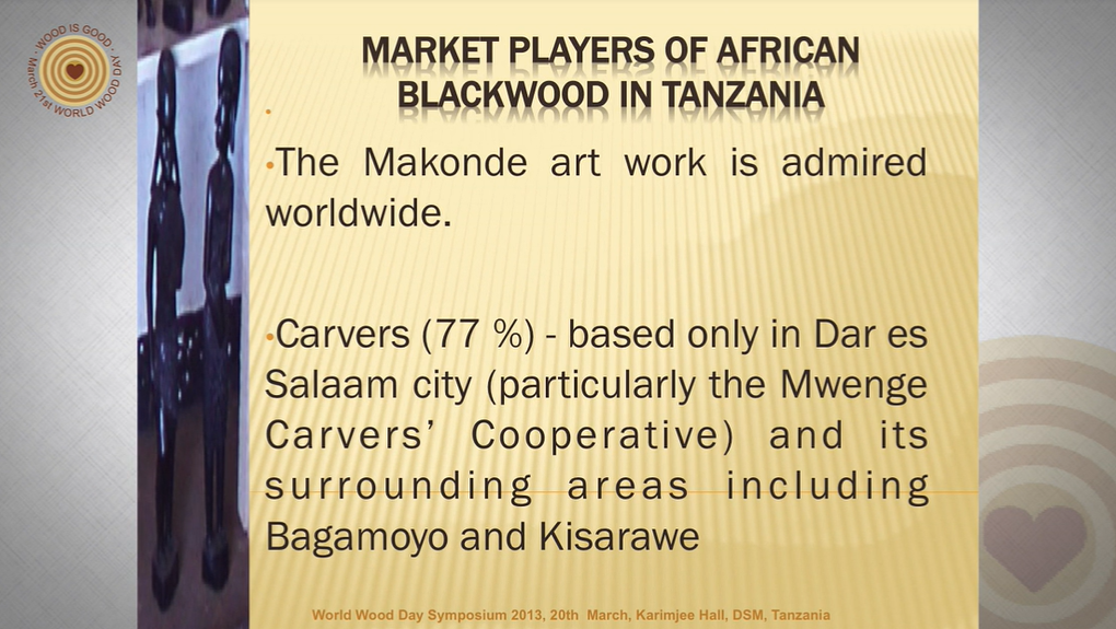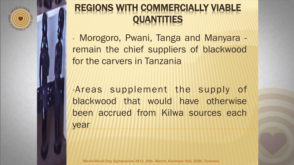 The African blackwood (Dalbergia melanoxylon Guill & Perr) is the national tree of Tanzania used for carving ornaments among main uses. Despite the value and importance, it has until recently, been neglected in terms of conservation. Analysis of the current market of blackwood and its long term sustainability was done focusing the attention on selected areas. Specifically a basic analysis on key regions with commercially viable quantities was done, established the likely stocks in terms of annual harvest, wood processed, and wood waste. Surveys and interviews with the stakeholders were used, supplemented with literature review. African blackwood in commercially viable quantities is found in the Southern regions of Tanzania namely; Lindi and Mtwara. The other potential areas are Pwani, Morogoro, Tanga and Manyara regions, catering for the carvings and the domestic market requirements. The total stocking volume was 75,392.1 m3 with harvestable volume of 58,203.3 m3. The total annual harvesting rate of blackwood was estimated at 4,482 m3 out of which about 3,500 m3 (79%) were wasted, 732 m3 (16%) were used for domestic purposes by households, 150 m3 (3%) were consumed in carvings and 100 m3 (2%) were exported sawn wood. Unless checked, it is unarguable that the future commercial exploitation of blackwood in the country is at a threat as most trees are illegally harvested at an unsustainable rate and wasted, yet there is insufficient natural regeneration taking place following frequent wild fires. The country needs an urgent national wide inventory of its Blackwood stocks to obtain the quantity, quality, increment and extent so as to enable planning of sustainable management of these resources. Carvers and other stakeholders need to be sensitized to integrate their activities in order to make more efficient use of the harvested trees. The African blackwood areas should be protected from illegal logging and wild fires. Early burning of blackwood areas should be encouraged and made an annual exercise. A national wide sensitization program to embark on planting African blackwood in either plantations or agro-forestry systems, after thorough tree breeding research is required.