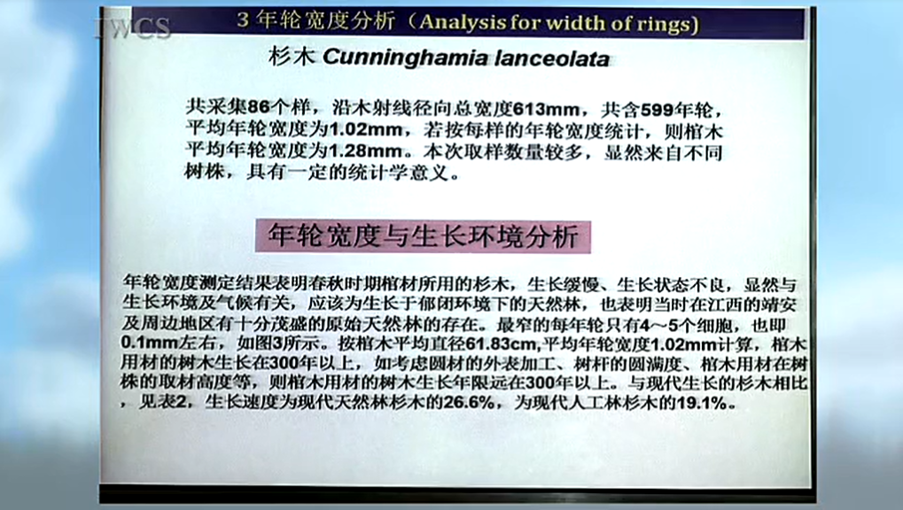 (3)船形棺平均直径61.83cm,平均年轮宽度1.02mm,棺木所用杉木直径大、通直圆满;显然当时当地杉木生长缓慢、生长状态不良,表明春秋时期在江西的靖安及周边地区存在大量生长于郁闭、十分茂盛的原始天然林。