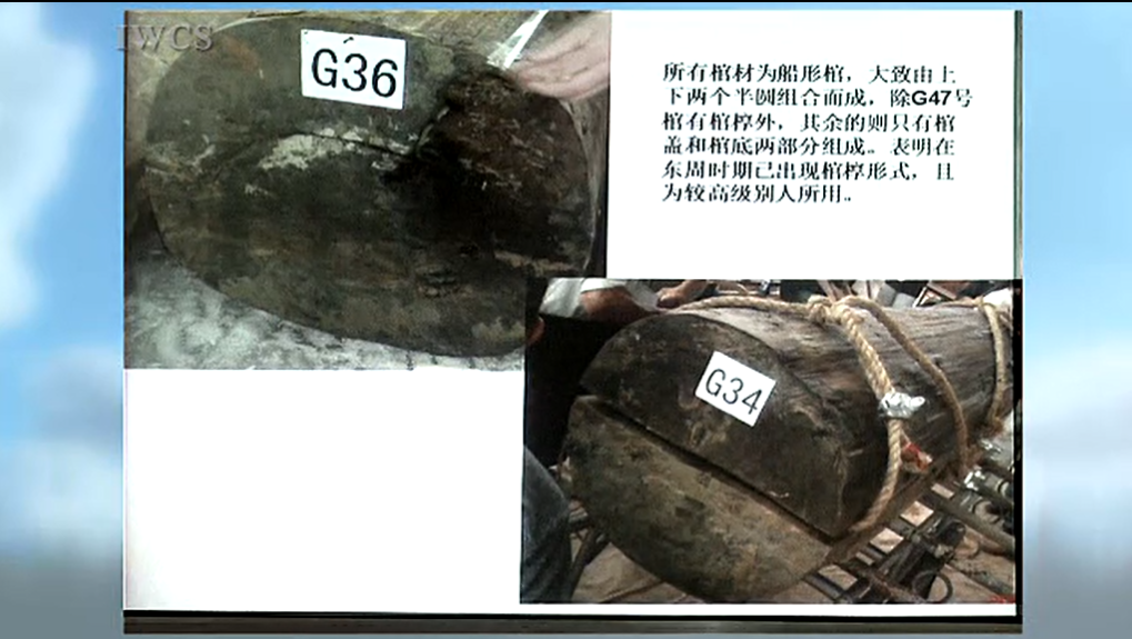 (4)棺木均为上下半圆形结构,用整原木对半剖开,从加工痕迹可以看出,上下交合面由用斧、锛类工具削平,应该还未出现刨和锯的加工方式。