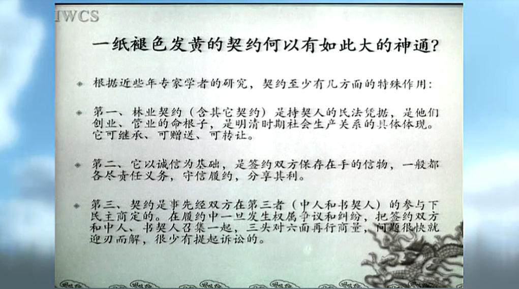遗存于民间数十万分林业契约的民主签订和诚信履行,是木材时代,青山常在的有效运营机制,也是林业社会管理的有效模式。明清时期,特别是清代,是以各种契约管理社会的时代。锦屏县档案馆现藏的4万份林地田土契约,90%以上是民间自主商定,没有加盖官府红印的“白契”,只有少量是经官府盖了大印的“红契”。那时,根本没有什么国家林业部、地方林业厅、林业局,也没有什么森林法,没有从中央到地方一竿子插到村村寨寨、各家各户的条条款款。这充分说明,大量的社会管理包括林业管理,是由民间自主进行的,自然90%以上的社会矛盾也是通过各种契约的规范约束在民间自行解决的。一纸褪色发黄的契约何以有如此大的神通?根据近些年专家学者的研究,契约至少有几方面的特殊作用。第一、林业契约(含其它契约)是持契人的民法凭据,是他们创业、管业的命根子,是明清时期社会生产关系的具体体现。它可继承、可赠送、可转让。它的后面连结着林地、林木、劳力、资金等林业要素市场,依此可随时快捷地形成新的生产力,促进林业生产的快速发展。第二、它以诚信为基础,是签约双方保存在手的信物,一般都各尽责任义务,守信履约,分享其利。第三、契约是事先经双方在第三者(中人和书契人)的参与下民主商定的。在履约中一旦发生权属争议和纠纷,把签约双方和中人、书契人召集一起,三头对六面再行商量,问题很快就迎刃而解,很少有提起诉讼的。因此,契约作为那时的民法文书,作为一种生产经营的运营机制,一种社会管理的模式,是民间林业和其他社会事业发展的有力保证。2010年春,时任国家林业局局长的贾志邦在全国林业厅局长会议上说:“贵州省锦屏县解放以前因为有林业契约,形成了稳定的山林权属关系和发展机制,森林经营管理得很好。老百姓年年砍树,年年种树,树越砍越多,就像年年宰猪年年养猪,猪越宰越多一样。”对过去的林业契约作了充分而形象的肯定。