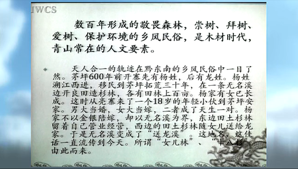 数百年形成的敬畏森林,崇树、拜树、爱树、保护环境的乡风民俗,是木材时代,青山常在的人文要素。人类从大自然中走来,又回到大自然中去。天人合一的轨迹在黔东南的乡风民俗中一目了然。茅坪600年前开寨先有杨姓,后有龙姓。杨姓溯江西进,移民到茅坪拓荒三十年,在一条无名溪边开良田造杉林,各有田林上百亩。杨家有女已长成。这时从亮寨来了一个18岁的年轻小伙到茅坪安家。男大当婚,女大当嫁,二者成了天生一对。杨家不以金银陪嫁,却以无名溪为界,东边田土杉林留着自己管业经营,西边的田土杉林随女儿送给龙家。于是无名溪变成了“送龙溪”。这地名、这佳话一直流传到今天。所谓“女儿林”、“十八杉”由此而来。在民间,难免有重男轻女的思想,哪家生了男孩,都要到护寨林里选准一颗参天古木,祭拜为孩子的“保爷树”,逢年过节,总要带着孩子到树下烧香化纸,磕头作揖,祈求孩子像古树一样经风雨,见世面,顶天立地,长成一个堂堂正正的大丈夫。苗村侗寨自古以来,像崇拜太阳那样崇拜森林与树木,把它作为图腾,年年进行群体祭拜。每到这天,寨上的男女老少往护寨林中集结,面对太阳,挪着退步,缓慢而肃穆地渐进丛林,至林子入口,火枪数响,硝烟弥漫。人们在神秘的气氛中,来到被称为“树王”的下面,大把大把地烧香,大叠大叠地化纸,不断打躬作揖。领祭人口中念念有词,其意是”“风调雨顺,林茂粮丰,国泰民安。”祭毕,又火枪数响,众人才在林中的草坪上且歌且舞,同踩芦笙。最后一路欢声笑语,回到自己的吊脚楼。震撼人心的是,芭莎苗寨对男人亡故的喪葬。这最自然、最典型、最发人深思。亡故者出生时,均要适地植树一棵,精心调理,男孩成人,自己管护,直至年迈辞世,众人才采制棺材,将亡人入土为安,并在坟地植上新株,以人树合一,生死相依,回归自然。这就是芭沙人的生命辩证法。这些古往今来的乡风民俗,为呵护森林,保护环境,仍在客观上发挥一定的作用。
