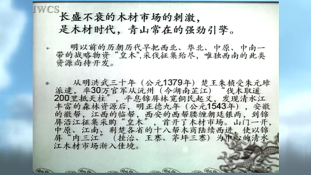 养家糊口,发家致富是木材时代,青山常在不竭的原动力。锦屏等县历来山多田少,山林关系到每个人的生家性命,涉及到人们的衣食住行。用林农的话说,他们“房子住在杉树里,粮食长在杉树上,过桥踏着杉树走,穿衣盼着木价涨。”大量的锦屏文书(也叫清水江文书,即林业契约)证明,几百年前,世世代代生活在清水江两岸无地或少地的苗族、侗族等各族山民和一部分破产、逃亡、经商而来的中原、荆楚移民以契约的形式在清水江两岸大量租山(佃山)造林,其成果与山主或四六、或对半、或倒四六分成,以此维持自己的生计。“山多田少无路走,天赐清江田一坵。不开船来不打鱼,造林放排糊家口”。此则民谣就是这种生活方式的真实写照。那些有山有林、多山多林的殷实人家或自力或雇请社会劳力造林营林,使其山林拥有成千上万亩。如地主而木商,木商而地主的“姚百万”(姚玉魁)、姜志远、龙集蛟等。以致清水江从锦屏茅坪至清江(古剑河)200里森林“翼云承日,无空土,无漏阴,杗桷之材糜不具备。”(乾隆贵州巡抚艾必达《黔南识略》)长盛不衰的木材市场的刺激,是木材时代,青山常在的强劲引擎。清水江明清时期的林木砍伐了几百年,也扩大再生产了几百年。木材为何生生不息,越砍越多?其间,得力于木材市场的持续刺激。明以前的历朝历代早把西北、华北、中原、中南一带的战略物资“皇木”,采伐征集殆尽,唯独西南的此类资源尚待开发。从明洪武三十年(公元1379年)楚王朱桢受朱元璋派遣,率30万官军从沅州(今湖南芷江)“伐木取道200里抵天柱”,平息锦屏林宽侗民起义,发现清水江丰富的森林资源后,明正德九年(公元1543年),安徽的徽帮,江西的临帮,西安的西帮腰缠朝廷银两,到锦屏沿江征集采购“皇木”,首开了木材市场。山门一开,中原、江南、荆楚各省的十八帮木商陆续西进,使以锦屏“内三江”(挂治、王寨、茅坪三寨)为中心的清水江木材市场渐入佳境。到清嘉庆年间木市鼎盛时,“内三江”木业行户(木业中介组织)竟达240余户,其中茅坪就占了半壁河山。往来于各行户的山客(本地木商)、水客(各外省木商)络绎于道,门庭若市。广大山民的养家糊口在此有了着落,国课(木植税)有了保障,内外木商的万贯家产也得以原始积累,各方都尝到了甜头。有眼光的外地木商,也开始在此投资兴林。于是耕山造林热潮也由此出发,更加磅礴于清水江两岸。以木材市场为纽带,形成了清水江“一江木材向东流”的延续了数百年的木材时代。