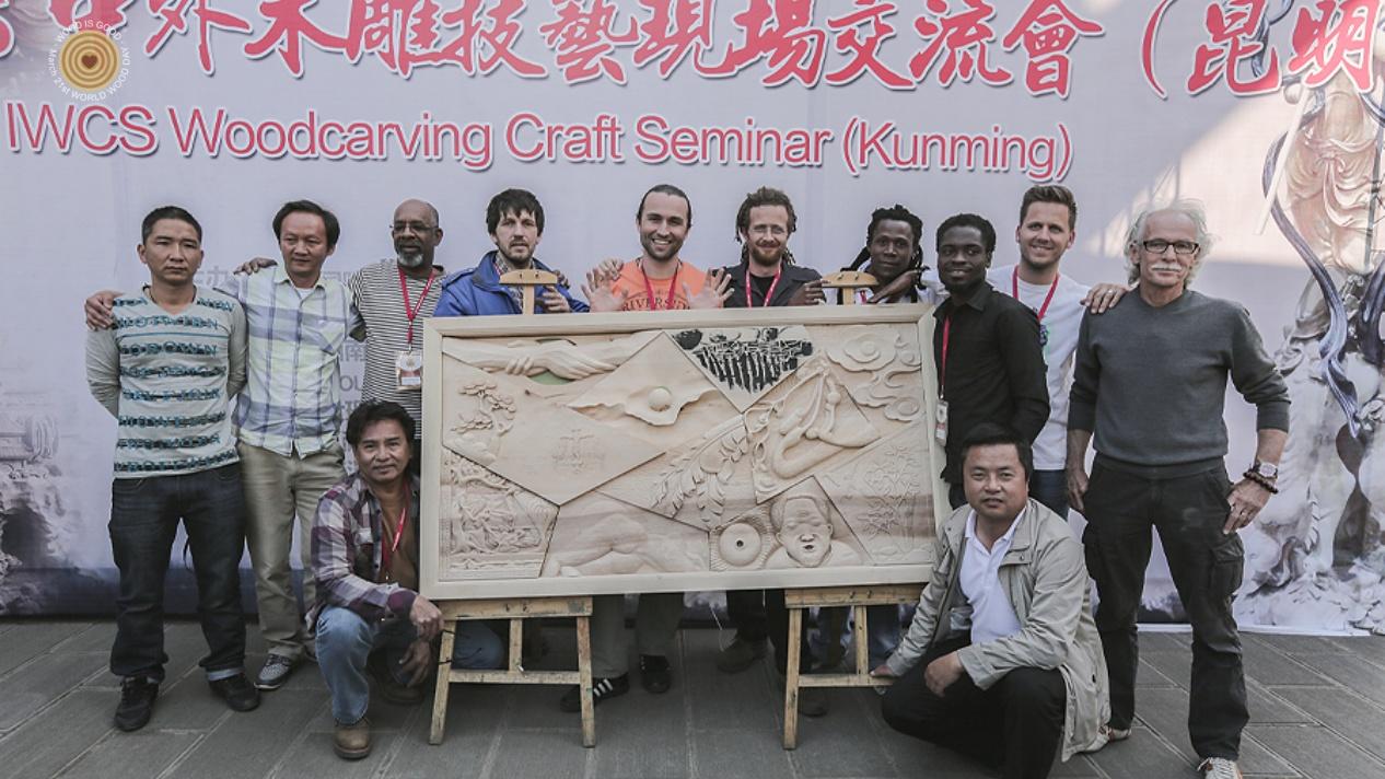 2014IWCS中外木雕技艺现场交流会在云南省昆明市西南林业大学成功举行。本次交流会汇聚了瑞士、塞尔维亚、法罗群岛、牙买加、贝宁、博茨瓦纳、帕劳、新喀里多尼亚和中国共9个国家的12位木雕艺术家。两天时间完成的集体创作,兼具了西方的抽象和东方的具象、丰富多元。活动期间,不同国家的艺术家分享了木雕的乐趣,同学们也与艺术家们零距离接触,木雕艺术无国界。