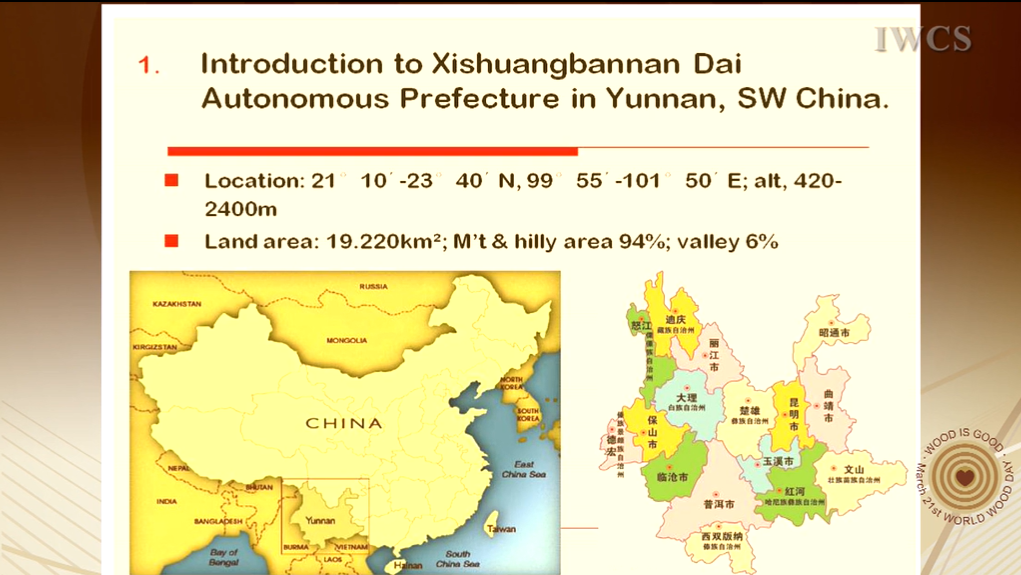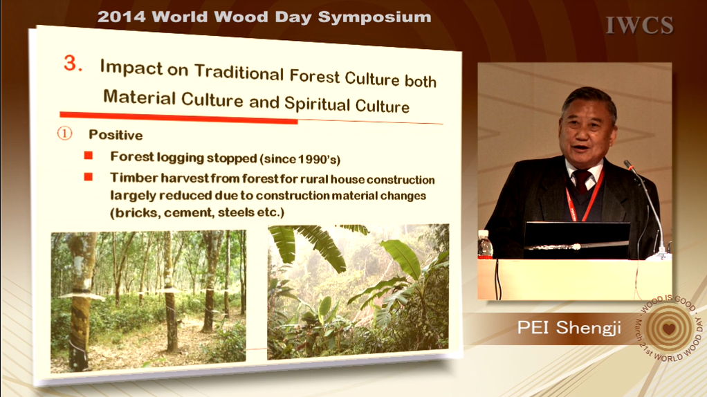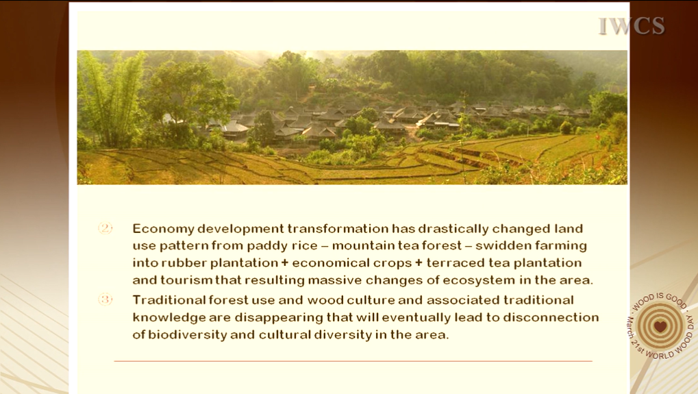 Over the last half century, a remarkable change was happened in socio-economy-environment of Xishuangbanna. A great progress has been made in political system, people life and living standards as well as public facilities. At the same time forest land was largely converted into rubber plantation, biodiversity is declining and environment is degraded. The changing Xishuangbanna today is seen as a good example of China’s modern development and globalization linkages. The impact of modern development on traditional forest culture is suggested to be a strong support to analysis the impact on traditional forest culture both positively and negatively. This paper discusses: Positive impact covering large reducing timber and fuel wood harvesting from forest; stopping shifting agriculture in mountain forest area; prohibition of hunting, and livelihoods of rural people much improved. Negative impact including large forest land converted into rubber plantation; forest degradation, biodiversity lost, and disappearing of traditional knowledge on forest management and conservation that will be leading to s significant change of people’s cultural values on forest including wood culture and sustainable development in the region.