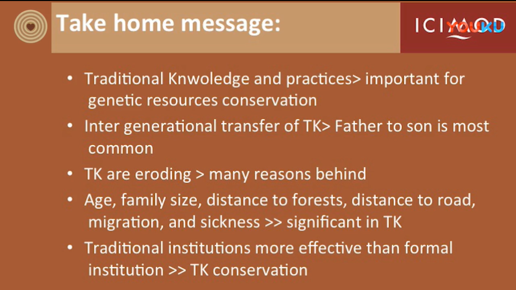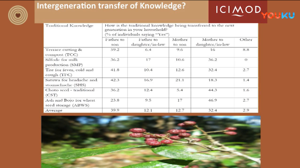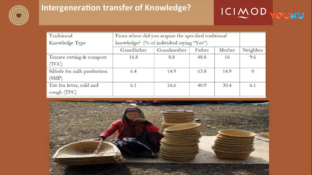 The study documented 56 types of TK from the study area and were classified into three categories; namely- agriculture and livestock (20 types), traditional medicine (32 types), and genetic resource conservation (4 types). Out of the total, six TK were selected - two from each of the three categories for detailed evaluation in household survey. The selected TK's were terrace cutting and composting; Use of Silfode for milk production; Use of Tite to treat fever and cold and cough; use of Satuwa for headache and stomachic; Choto seed production in traditional way; and Use of ash and Bojo/Timur for wheat seed storage.
