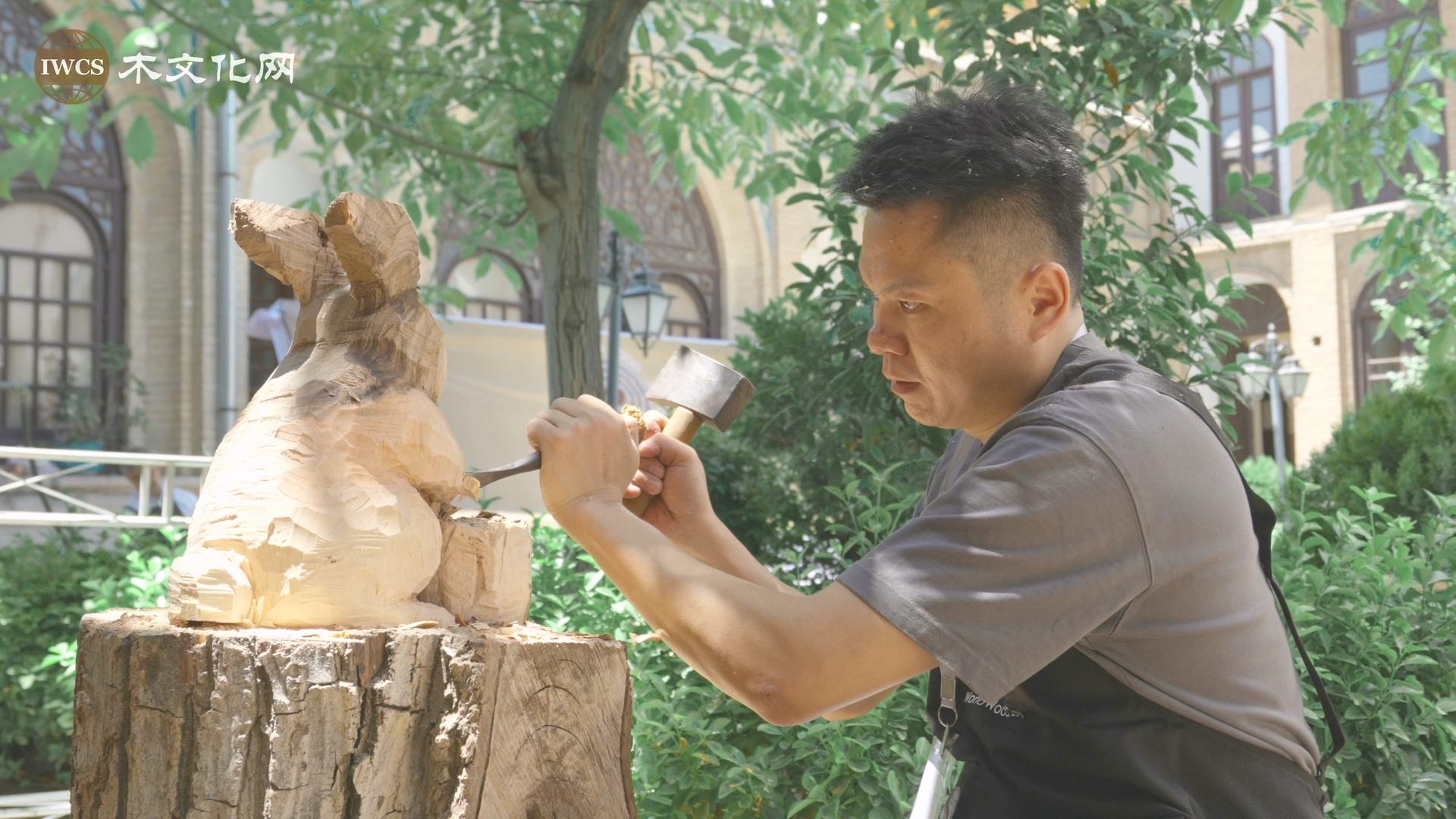 两件作品分别为兔子与雄鸡造型,二者均取材于中国传统十二生肖,富含中国传统文化元素。雄鸡作品则先以电锯粗雕定型...